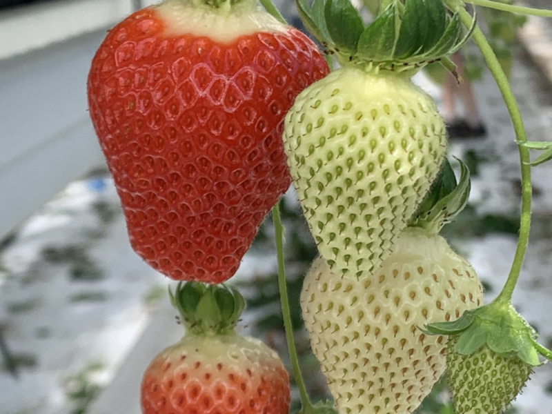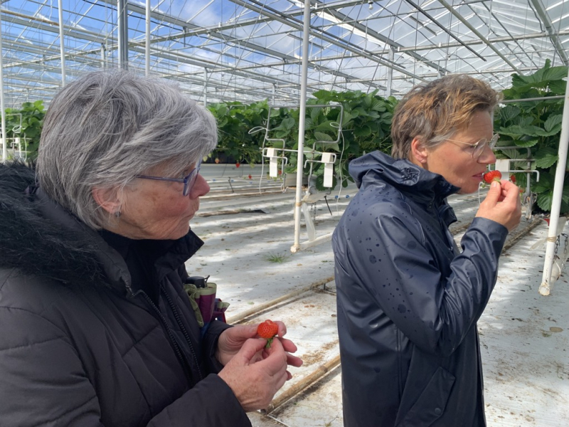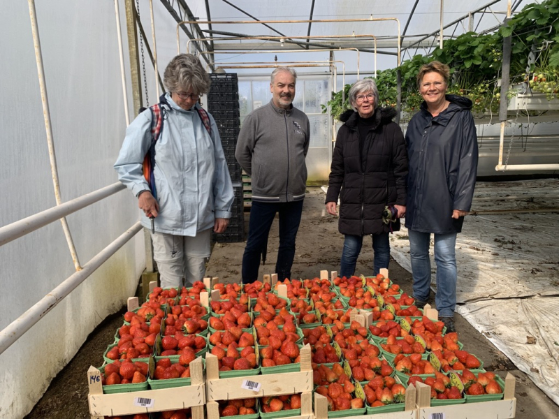 Bij de plaats waar de st. Jan de Doperkerk van Wiel gestaan heeft werd even stilgestaan. Op een vorige tocht hadden we het doopvont wat in die kerk stond al gezien. Bij de negen gezinnen gingen we via een half onder water staande boomgaard naar de Wielseweg. Bij kleinfruitbedrijf van Beusichem-de Waal werden we bijzonder gastvrij ontvangen. We kregen een rondleiding door de kassen waar de aardbeien wachten om geplukt te worden. We mochten zelfs proeven. Deze week is er een zwart Hanoveraans veulentje geboren. Ook dat werd bewonderd. Tenslotte mochten we aan de thee/koffie met beschuit met natuurlijk aardbeien.
