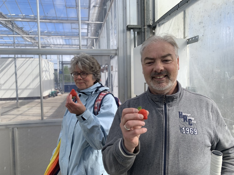 Bij de plaats waar de st. Jan de Doperkerk van Wiel gestaan heeft werd even stilgestaan. Op een vorige tocht hadden we het doopvont wat in die kerk stond al gezien. Bij de negen gezinnen gingen we via een half onder water staande boomgaard naar de Wielseweg. Bij kleinfruitbedrijf van Beusichem-de Waal werden we bijzonder gastvrij ontvangen. We kregen een rondleiding door de kassen waar de aardbeien wachten om geplukt te worden. We mochten zelfs proeven. Deze week is er een zwart Hanoveraans veulentje geboren. Ook dat werd bewonderd. Tenslotte mochten we aan de thee/koffie met beschuit met natuurlijk aardbeien.